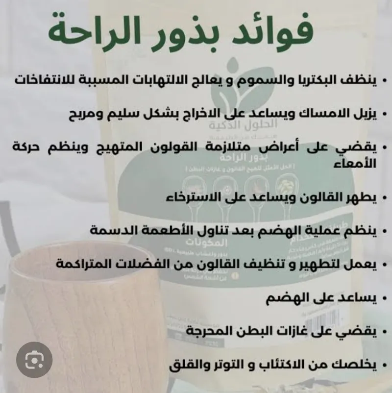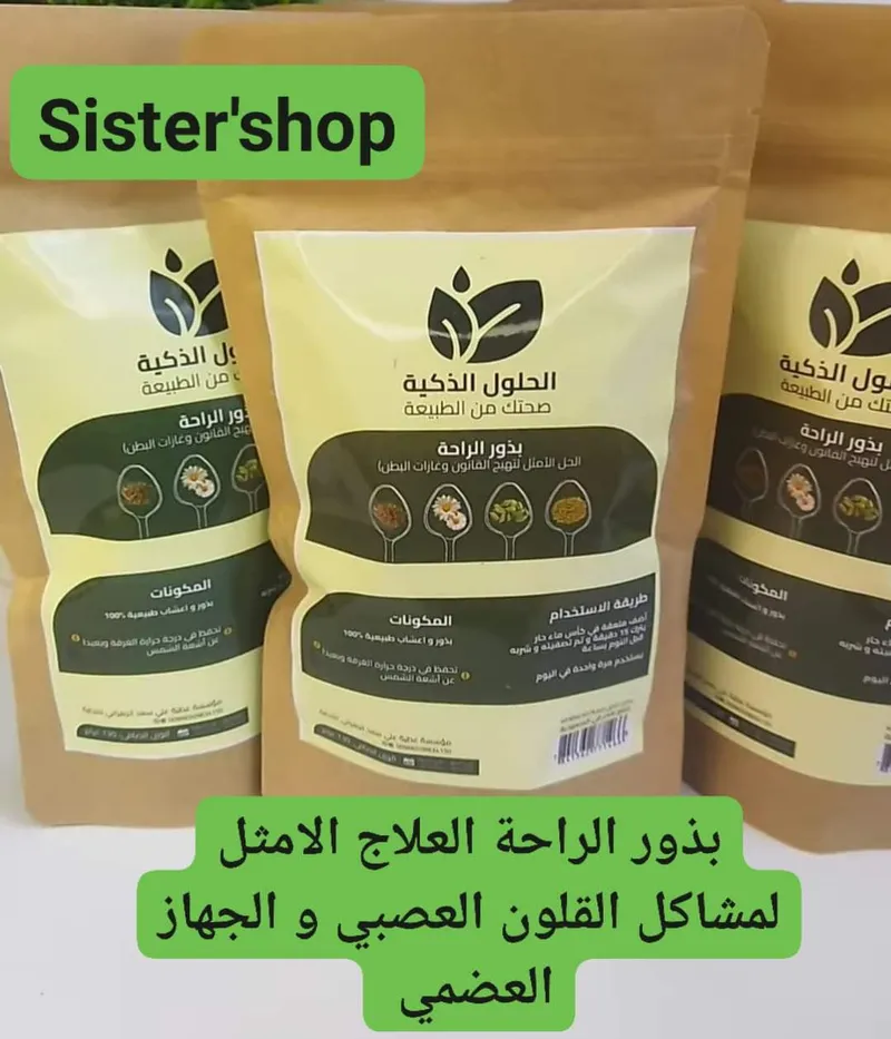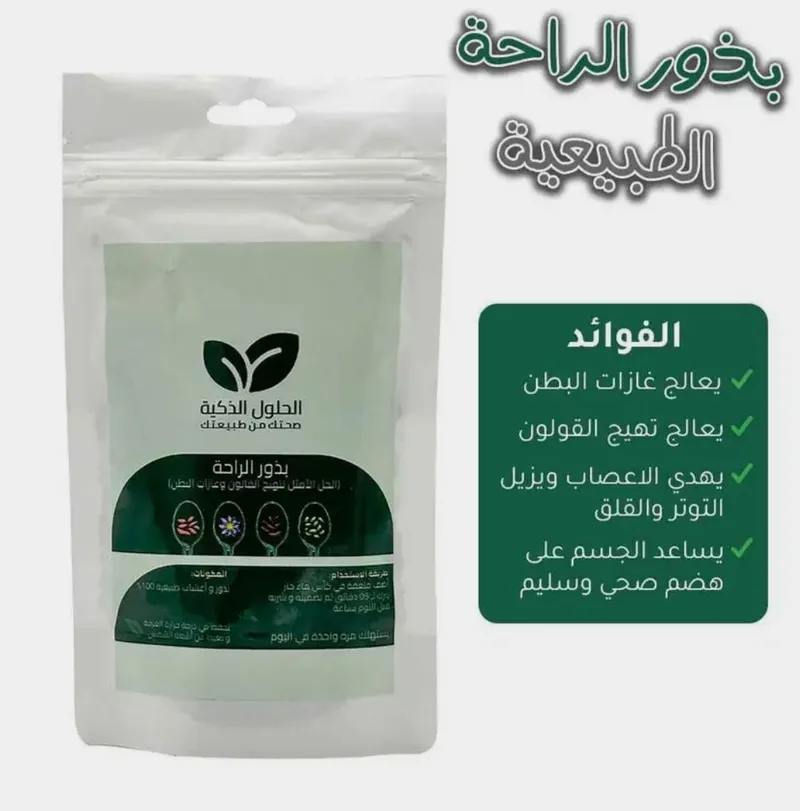 بذور الراحة 🌿 اعشاب طبيعية علاج فعال لمشاكل القولون و الجهاز الهضمي بذور الراحة الحل النهائي للتخلص من مشاكل القولون العصبي و الجهاز الهضمي تعتبر بدور الراحةعلاج فعال للقولون العصبي و الحل الأمثل لتهيج القولون ولإنتفاخات البطن و الغازات والامساك فهي اعشاب طبيعية 100%🌿🌿 تعتبر افضل الأنواع الطبيعية البديلة لأنه يساعد على انتظام عملية الهضم بشكل طبيعي وآمن و للاحساس باهدوء والراحة